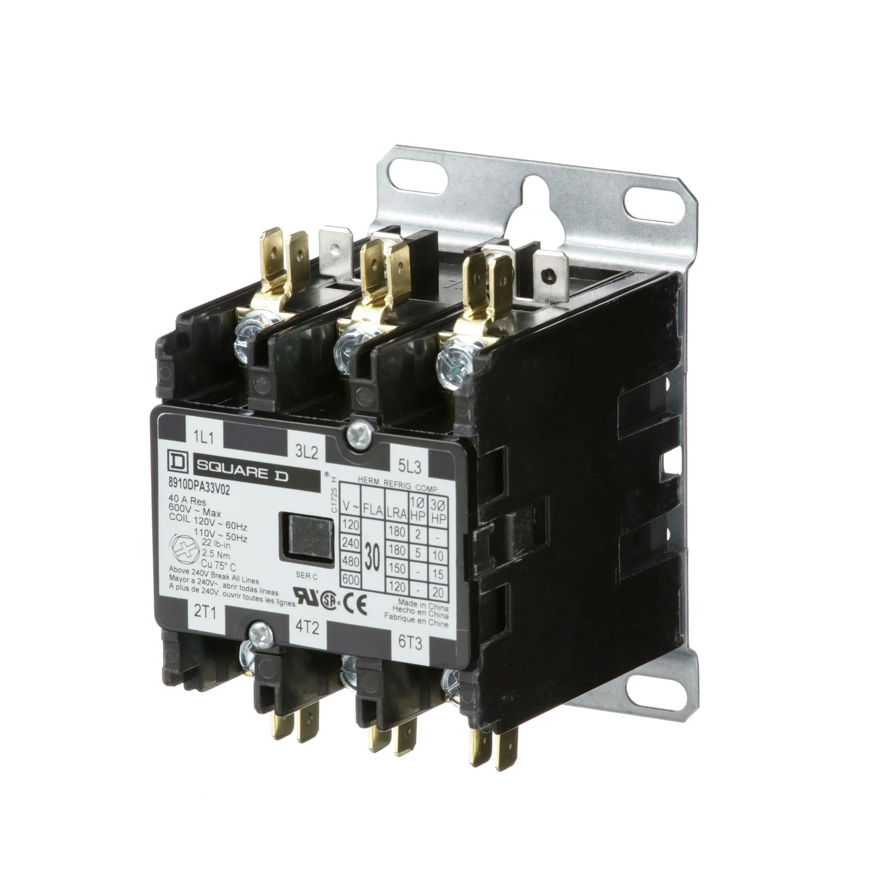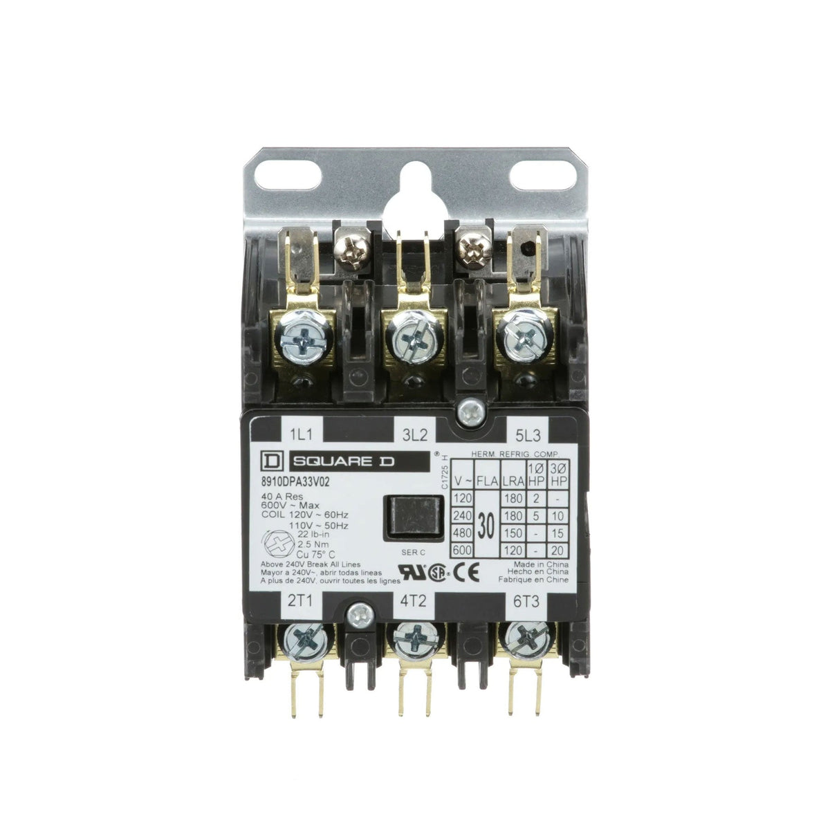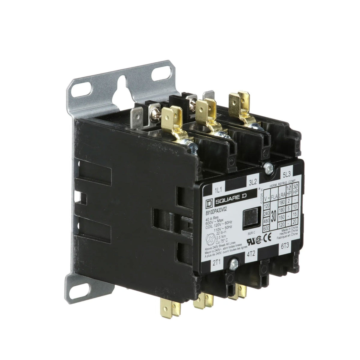 8910Dp Definite Purpose Magnetic Contactors Are Designed For Heating, Air Conditioning And Refrigeration Applications. This Line Of Definite Purpose Contactors Has Current Ratings Up To 120 Amperes Resistive And 50 Hp At 600 Vac. This Three Pole Definite Purpose Contactor Has A Full Load Rating Of 30 Ampere And A Resistive Rating Of 40 Amperes. It Also Has A 2 Hp At 115 Vac Single Phase, 5 Hp At 230 Vac Single Phase And 10 Hp At 230 Vac Three Phase, 15 Hp At 460 Vac Three Phase And 20 Hp At 575 Vac Three Phase. The Nonreplaceable Coil Is Available With A Variety Of Coil Voltages. This Device Has A 110/120 Vac 50/60 Hz Coil. The Contactor Has Straight Through Wiring. Contactor Is 3.75 Inches By 2.37 Inches And 3.00 Tall. These Contactors Are Ul Component Recognized And Csa Certified.