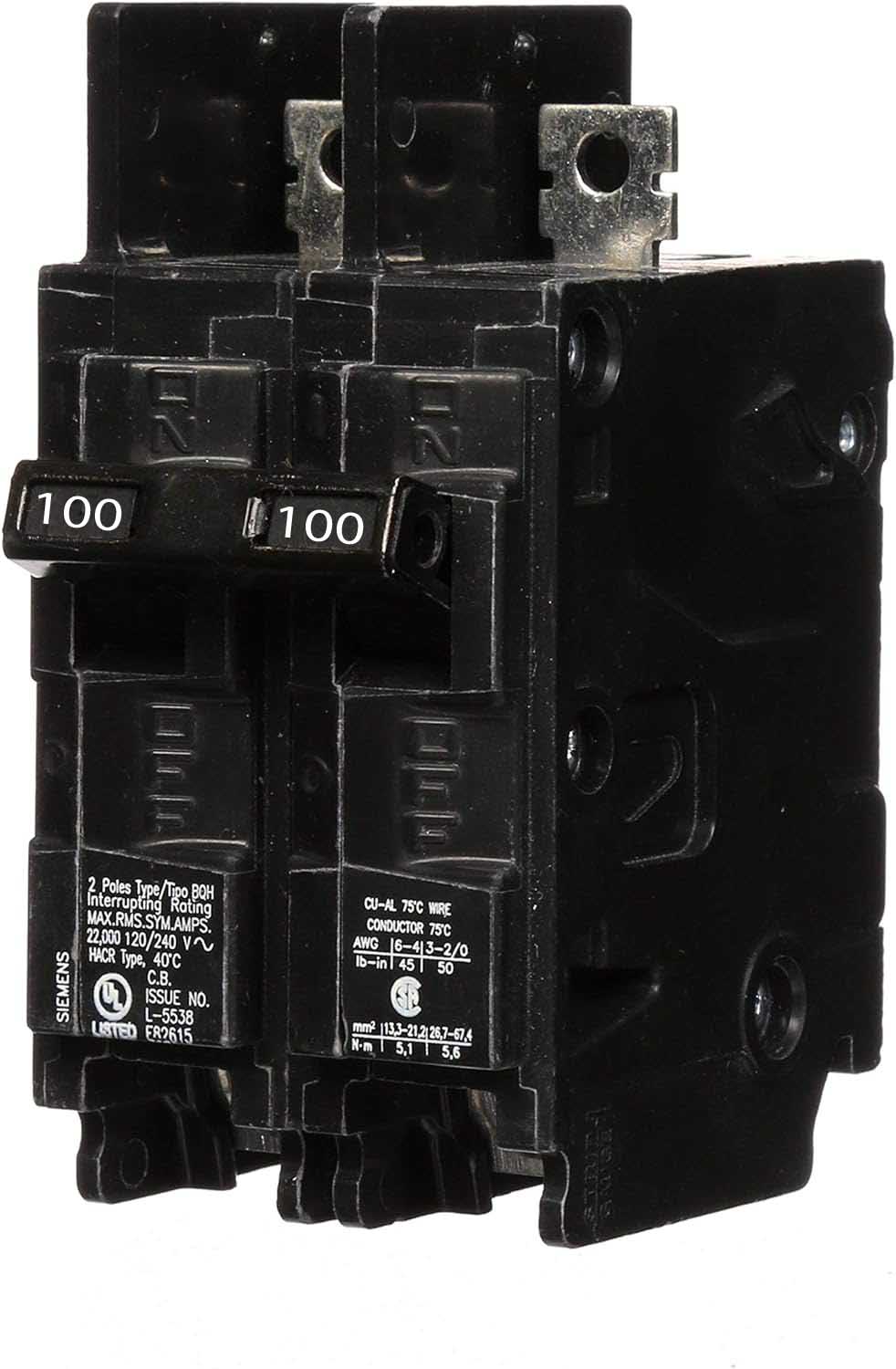 Siemens double pole single phase 100 ampere bolt-on molded case circuit breaker with maximum voltage rating of 240V tripping method thermal magnetic and high interrupting rating of 22 kiloampere at 240V functions long-time and instantaneous.