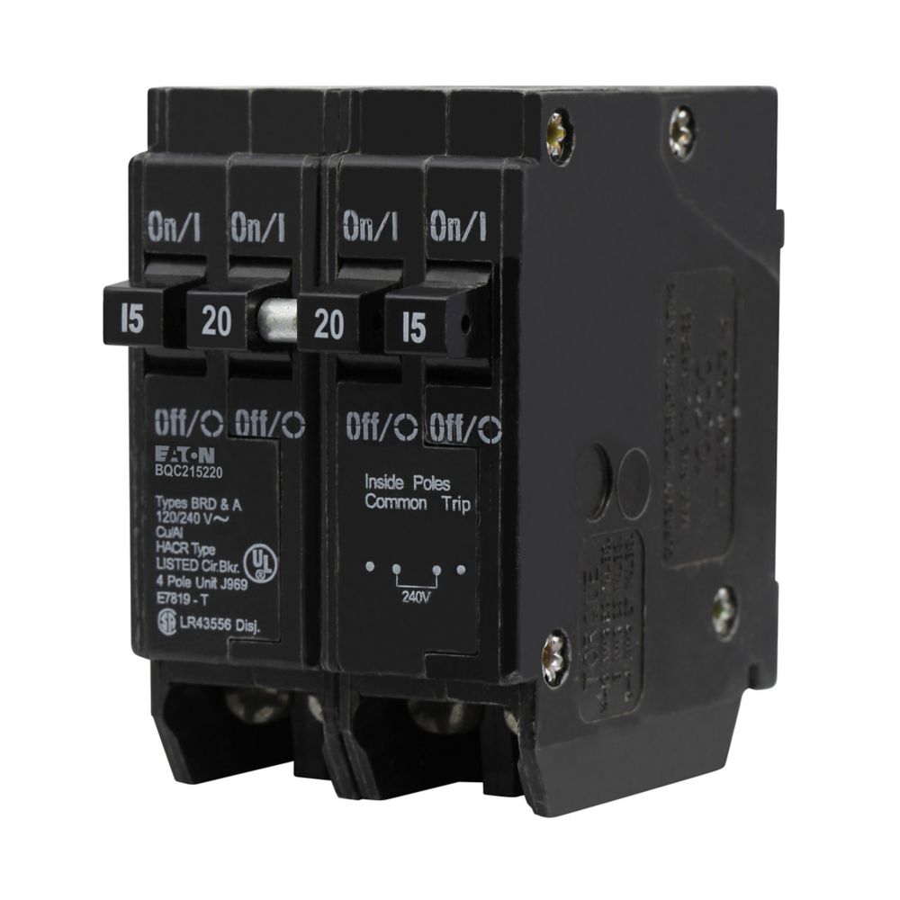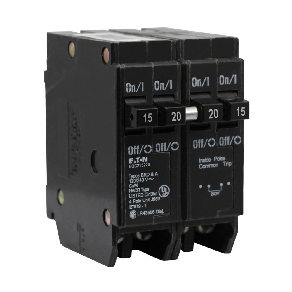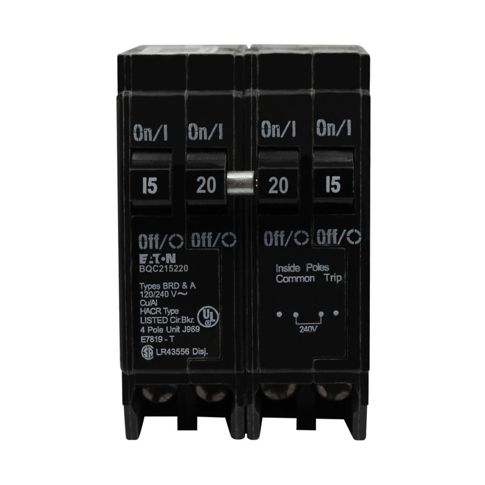 Eaton BR thermal magnetic circuit breaker,Type BQC 1-Inch CTL plug-on circuit breaker,Includes rejection tab feature,(2) Single-Pole 20 A, (2) Two-Pole 15 A,10 kAIC,Four-pole,120/240V,BQC,Common breaker trip,#14-4 AWG Cu/Al,BQC