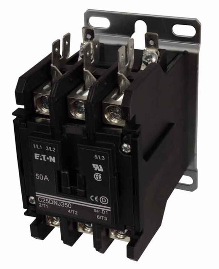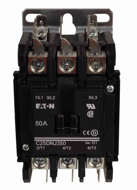 C25DRJ350A, Cutler Hammer, C25 Series, type C25, 3P, 1 and 3PH, 50A, 600V, Inductive Full Load 50A; Resistive 65A; Maximum Motor 10hp @ 1PH, 15hp and 30hp @ 3PH; complete with 110V-120V 50/60Hz, AC coil, pressure plate with quick connect terminals (vertical in-line), open type definite purpose contactors with DIN rail adapter, suitable for use with Cutler Hammer definite purpose motor control systems