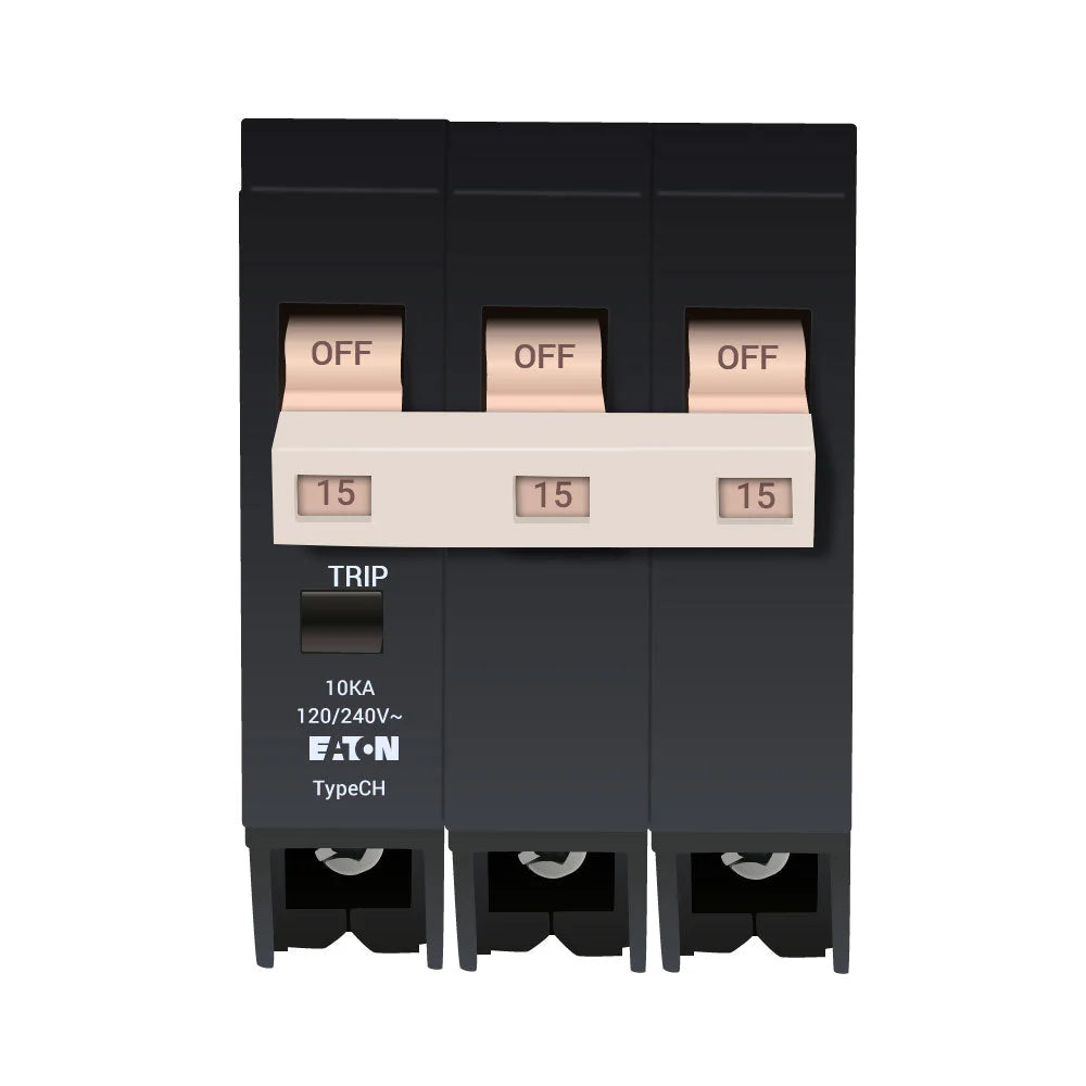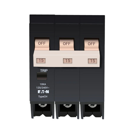 Eaton / Cutler-Hammer Plug-On Circuit Breaker Its Compact And Easy to Install three pole circuit breaker features thermal magnetic molded case for extra protection circuit breaker has a current rating of 15 amps and voltage rating of 240 Vac it is a common trip breaker that has AIC rating of 10000 amps and accommodates copper/aluminum wire of size 14 - 8 AWG 14 - 10 AWG at 60 or 75 deg C circuit breaker is Ul 489 listed and Csa certified.