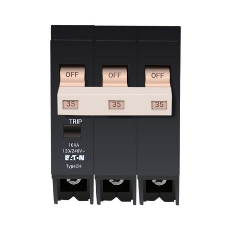 Eaton Cutler-Hammer CH series three pole 35 ampere plug-on molded case circuit breaker with maximum voltage rating of 240V trip type common trip thermal magnetic and high interrupting rating of 240V functions long-time and instantaneous used on load centers.