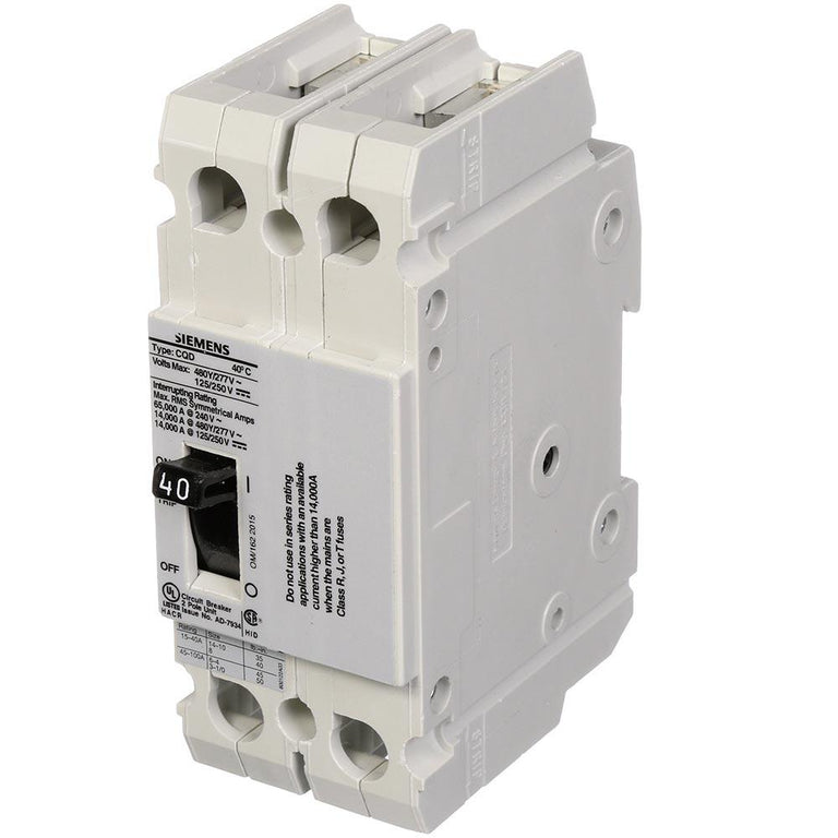 Siemens, CQD Series, type CQD, 2P, 1PH, 40A, 277/480V, 14kA@480V, standard interrupting capacity, 40 degree C, feed-thru, complete with LI - Long-Time and Instantaneous trip functions and line & load side lug terminals, thermal magnetic molded case circuit breakers.