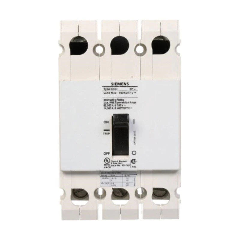 Siemens, CQD Series, type CQD, 3P, 3PH, 40A, 277/480V, 14kA@480V, standard interrupting capacity, 40 degree C, feed-thru, complete with LI - Long-Time and Instantaneous trip functions and line & load side lug terminals, thermal magnetic molded case circuit breakers.