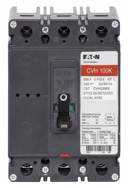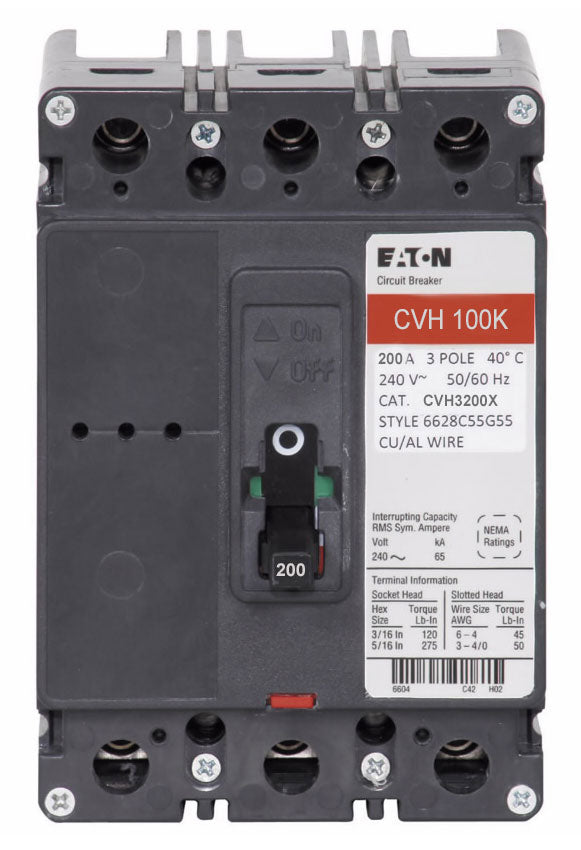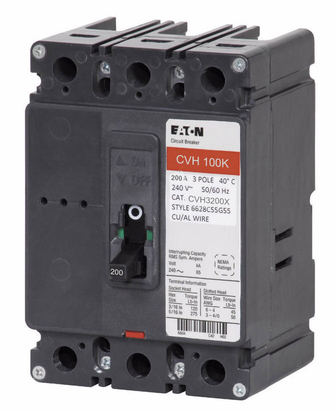 Eaton CVH Series, type CVH, 3P, 3PH, 200A, 240V, 100kA@240V, complete with load side lug terminals, standard interrupting capacity, 40CB0C, bolt-on, LI - Long-Time and Instantaneous trip functions.