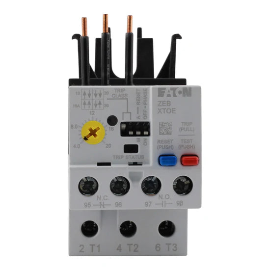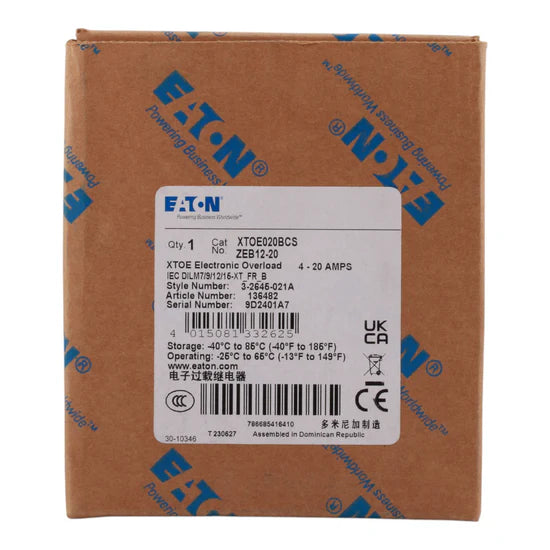 The Eaton XTOE020BCS is a 4–20 Amp electronic overload relay designed for XT IEC contactors and motor starters. With selectable trip settings (10A, Class 10, 20, 30) and NO/NC contacts, it ensures precise motor protection in industrial applications. Its 45mm compact frame allows direct mounting on contactors, providing reliable overload monitoring and protection.