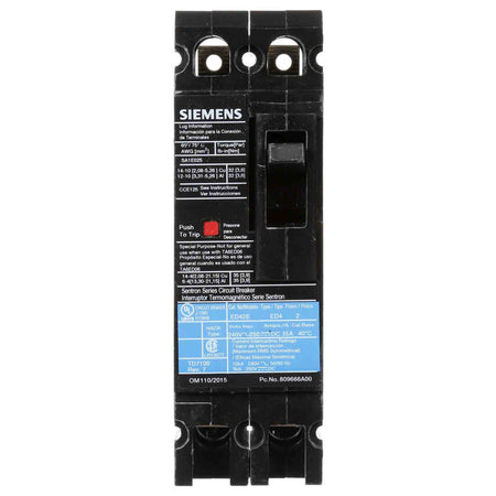 The Siemens ED42B025L is a Molded Case Circuit Breaker. This type ED circuit breaker is a member of The Sentron Series family. The ED42B025L is a 2 pole, 480 Volt, 25 amp rated circuit breaker, with an AIC rating of 18kA@480V. The ED42B025L is manufactured by Siemens. The ED42B025L uses a Feed-Thru connection. Includes Thermal Magnetic protection. Every part My Circuit Breakers sells is also backed by our industry-leading gold standard 2-year warranty.