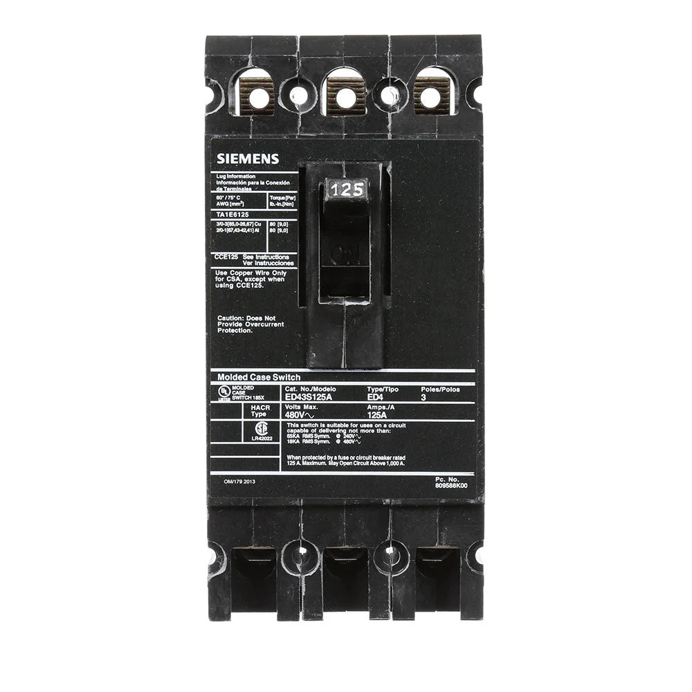 Siemens Plug-In Switch Its Compact And Easy to Install Three pole switch has an Ed4-frame with a current rating of 125 Amps at 40 deg C it has a voltage rating of 240/480 Vac and it has thermal magnetic trip units for circuit protection and terminal load lug for convenient connection siemens circuit breaker is Ul and Csa certified.