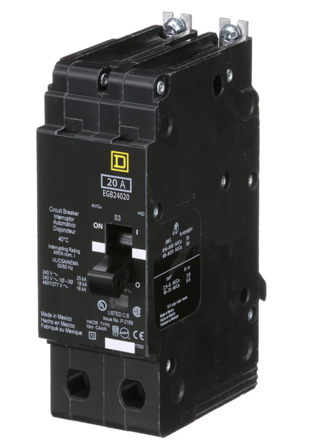 Schneider Electric / Square D's EGB24020 bolt-on molded case circuit breaker is a reliable and easy-to-install device designed for use in Square D NF Panelboards. This circuit breaker is CSA-rated, HID-rated and HACR-rated, and UL Listed as High-Intensity Discharge.