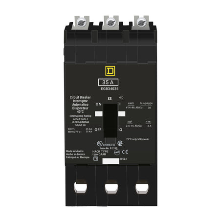 Schneider Electric / Square D's EGB34035 bolt-on molded case circuit breaker is a reliable and easy-to-install device designed for use in Square D NF Panelboards. This circuit breaker is CSA-rated, HID-rated and HACR-rated, and UL Listed as High-Intensity Discharge.