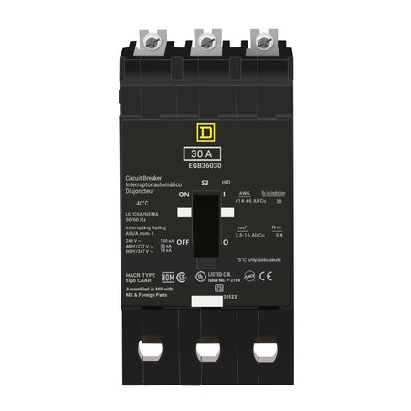 Schneider Electric / Square D's EGB36030 bolt-on molded case circuit breaker is a reliable and easy-to-install device designed for use in Square D NF Panelboards. This circuit breaker is CSA-rated, HID-rated and HACR-rated, and UL Listed as High-Intensity Discharge.