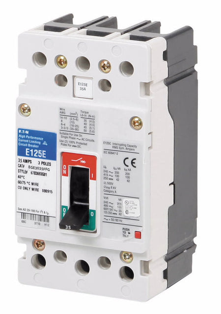 Eaton Series G molded case circuit breaker, EG-frame, EG, Fixed thermal, Fixed magnetic trip, Three-pole, 35 A, 600Y/347 Vac, 35 kAIC at 240 Vac, 25 kAIC at 480 Vac, 18 kAIC at 600Y/347 Vac, Line and load, 50/60 Hz