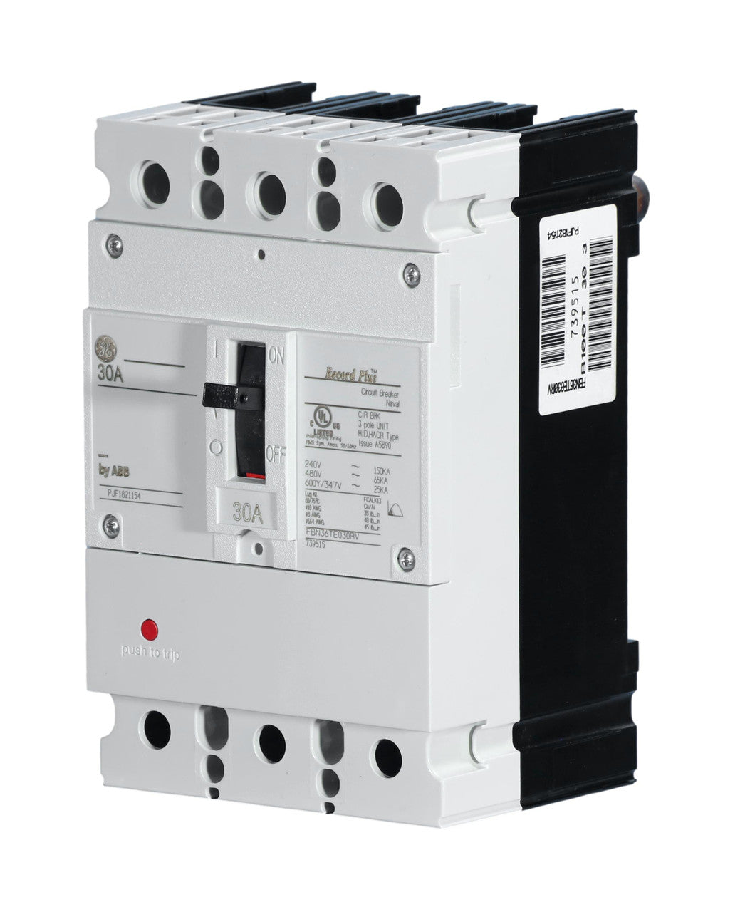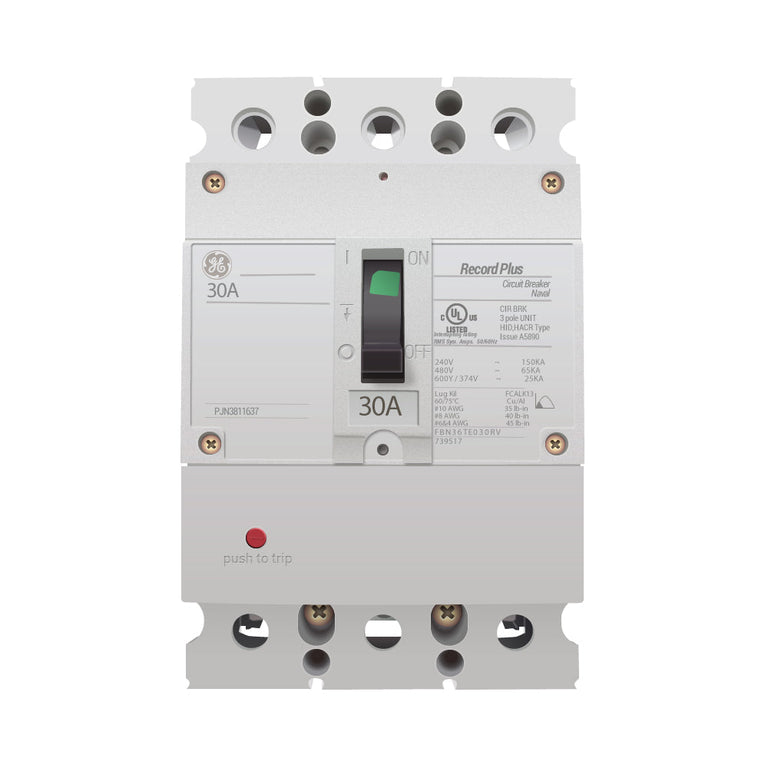 General Electric Record Plus, type FBN, FB100 frame, 3P, 3PH, 30A, 600V, 65kA@480V, high interrupting capacity, bolt-on, complete with LI - Long-Time and Instantaneous trip functions, load side lug terminals and panel connections.