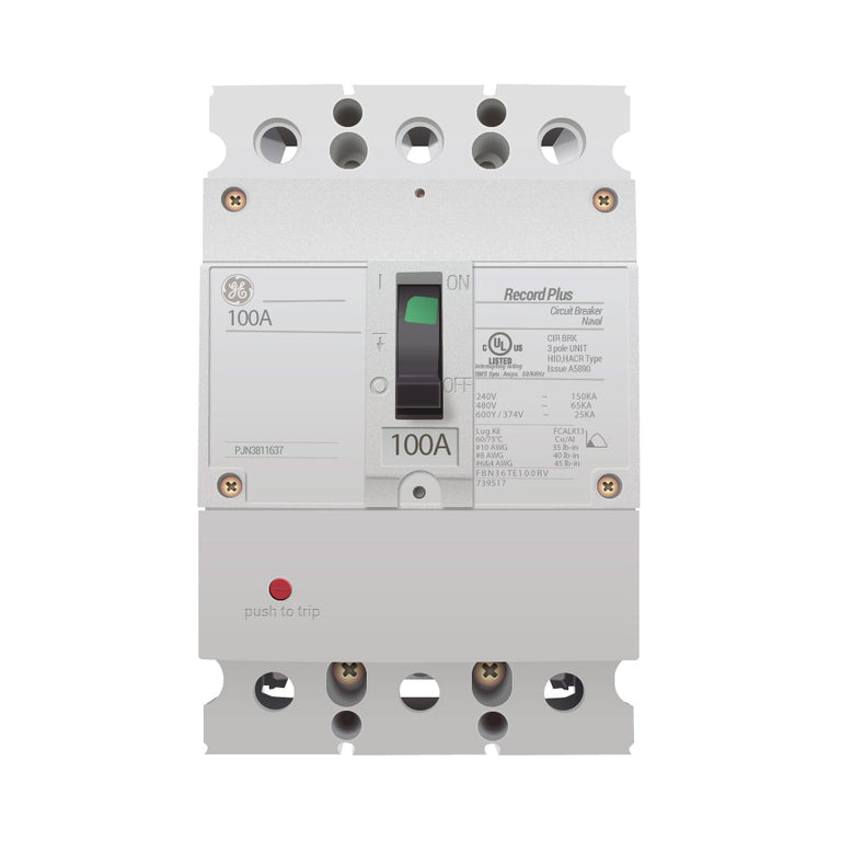 General Electric Record Plus, type FBN, FB100 frame, 3P, 3PH, 100A, 600V, 65kA@480V, high interrupting capacity, bolt-on, load side lug terminals and panel connections, fixed thermal magnetic.