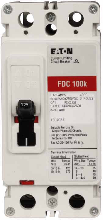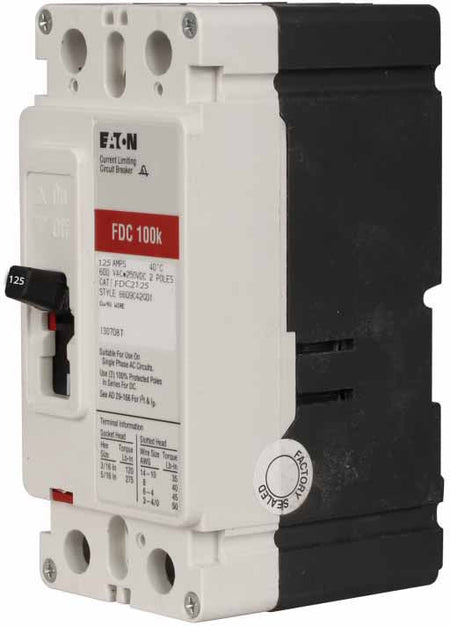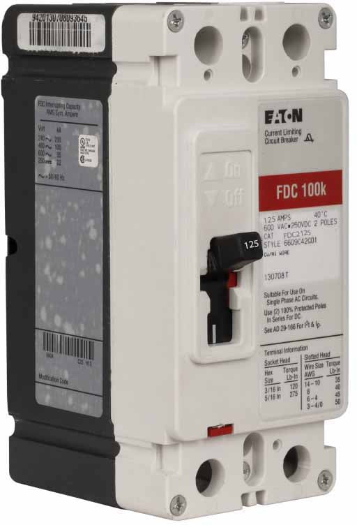 Eaton Series C complete molded case circuit breaker, F-frame, FDC, Complete breaker, Fixed thermal, fixed magnetic trip type, Two-pole, 125A, 600 Vac, 250 Vdc, 200kA@240 Vac, 100kA@480 Vac, Load side, 50/60 Hz