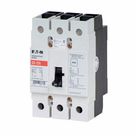 Eaton Series C complete molded case circuit breaker, G-frame, GD, Complete breaker, Fixed thermal, fixed magnetic trip type, Three-pole, 20, 480 Vac, 125/250 Vdc, 65 kAIC at 240 Vac, 14 kAIC at 480 Vac, 50/60 Hz
