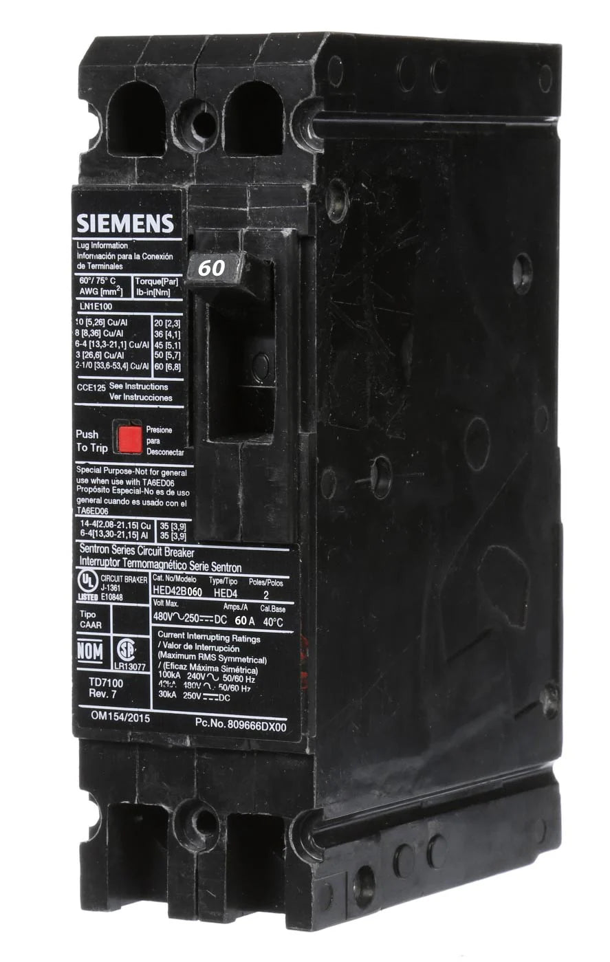 The Siemens HED42B060 is a Molded Case Circuit Breaker. This type HED circuit breaker is a member of The Sentron Series family. The HED42B060 is a 2 pole, 480 Volt, 60 amp rated circuit breaker, with an AIC rating of 42kA@480V. The HED42B060 is manufactured by Siemens. The HED42B060 uses a Lug In Panelboard connection. Includes Thermal Magnetic protection. Every part My Circuit Breakers sells is also backed by our industry-leading gold standard 2-year warranty.
