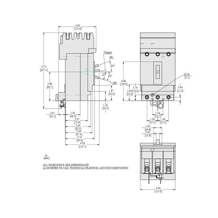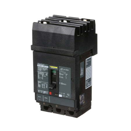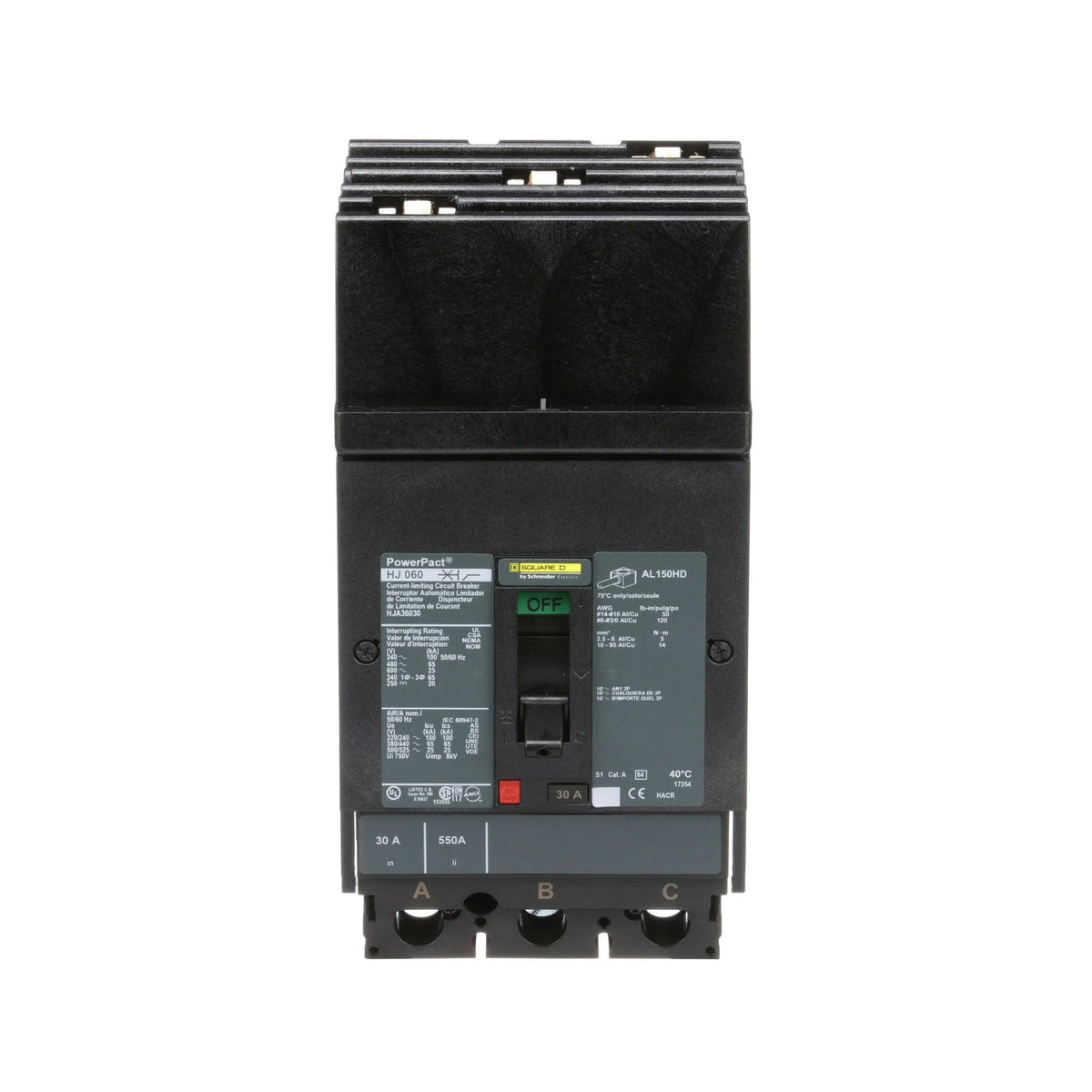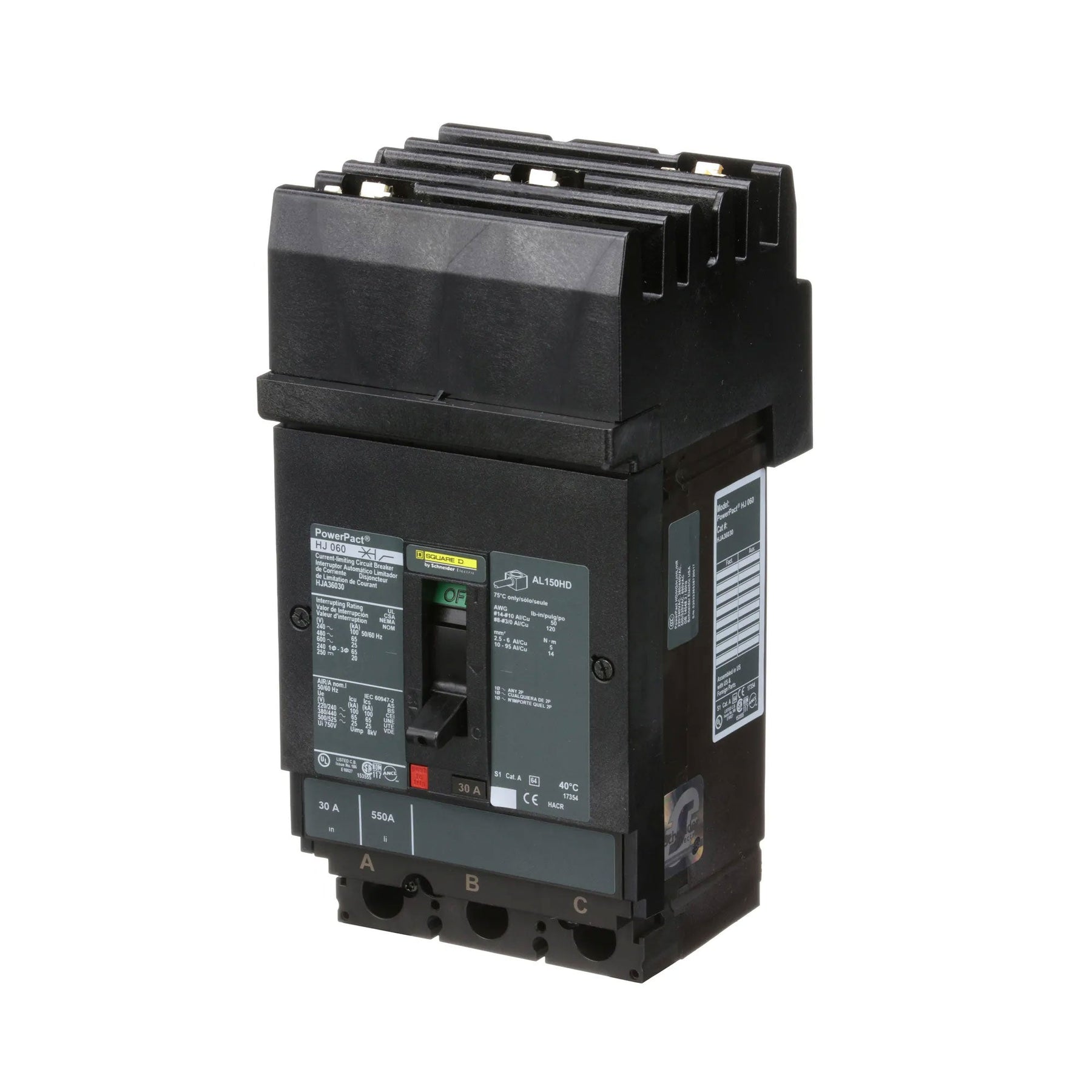 Square D, Powerpact, type HJA, 3PH, 3P, ABC phase connection, 30A, 600V, 65kA@480V, current limiting, i-line style plug-in, UL listed, suitable for reverse fed applications, complete with non-interchangeable trip, LI - Long-Time and Instantaneous trip functions, thermal magnetic, molded case circuit breakers.