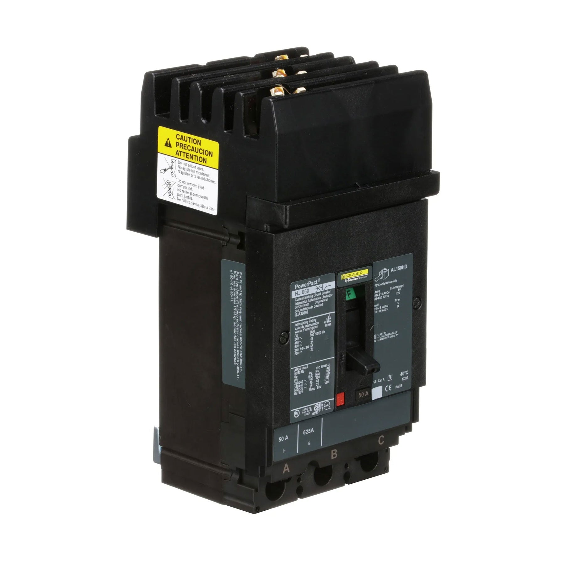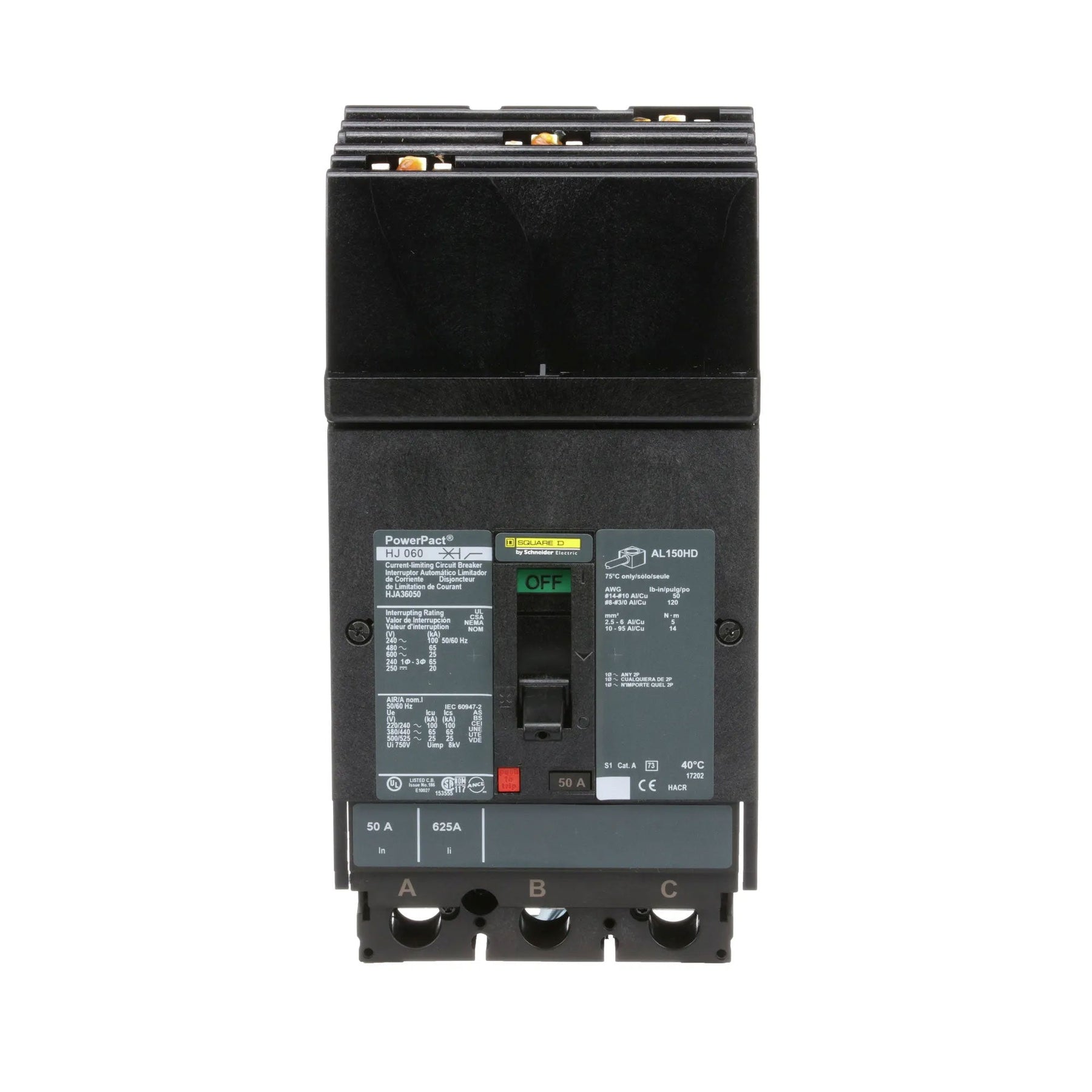 Square D, Powerpact, type HJA, 3PH, 3P, ABC phase connection, 50A, 600V, 65kA@480V, current limiting, i-line style plug-in, UL listed, suitable for reverse fed applications, complete with non-interchangeable trip, LI - Long-Time and Instantaneous trip functions, thermal magnetic, molded case circuit breakers.