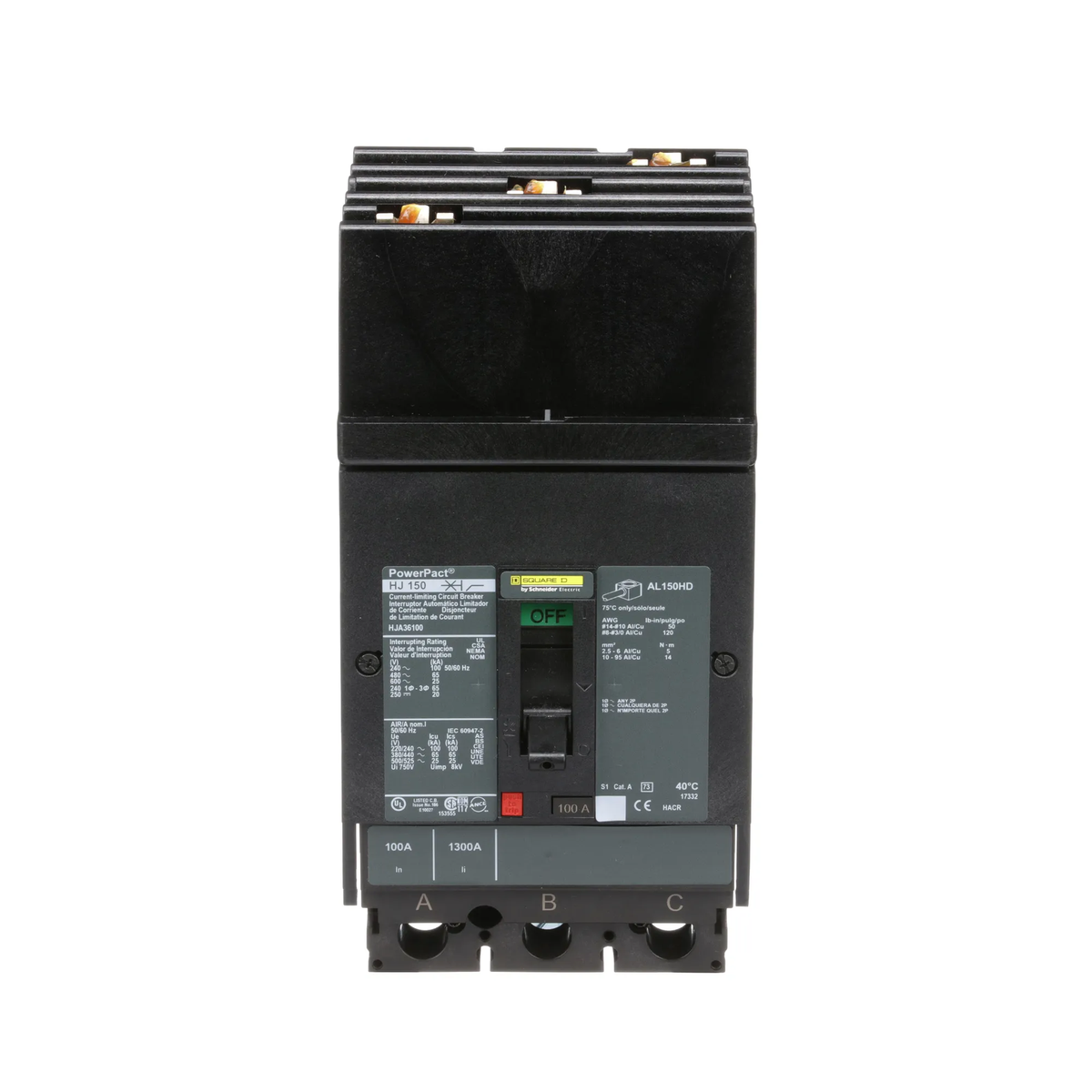 Square D, Powerpact, type HJA, 3PH, 3P, ABC phase connection, 100A, 600V, 65kA@480V, current limiting, i-line style plug-in, UL listed, suitable for reverse fed applications, complete with non-interchangeable trip, LI - Long-Time and Instantaneous trip functions, thermal magnetic, molded case circuit breakers.