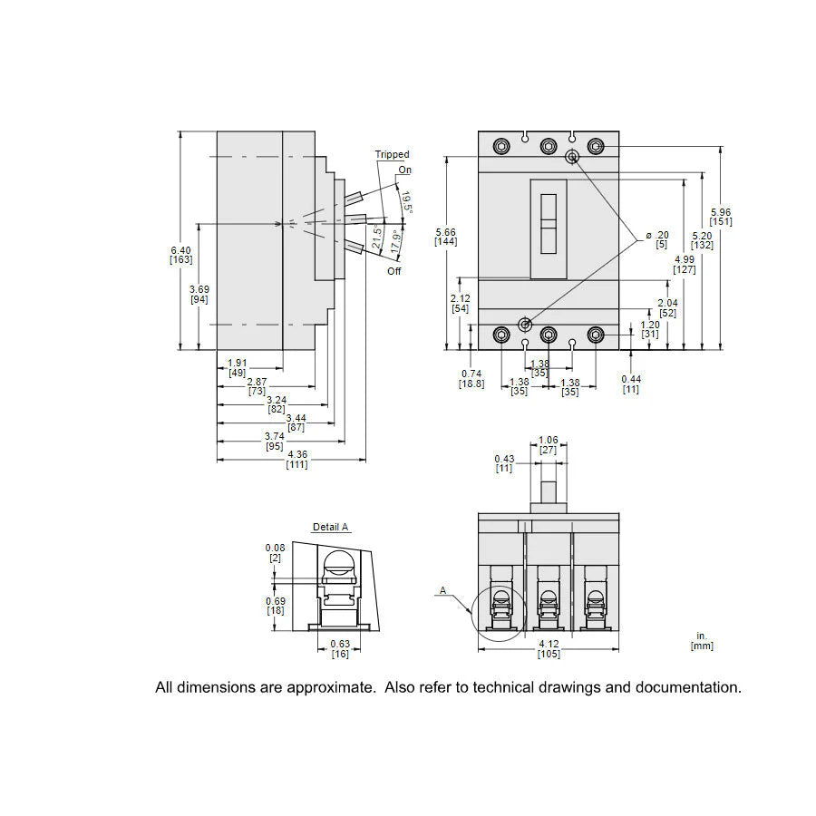 Square D,Schneider Electric, Powerpact, type HJL, 3P, 3PH, 20A, 600V, 65kA@480V, UL listed, current limiting, feed-thru, suitable for reverse fed applications, complete with 1A/1B auxiliary switch, non-interchangeable trip, LI - Long-Time and Instantaneous trip functions and line & load side lug terminals, thermal magnetic.