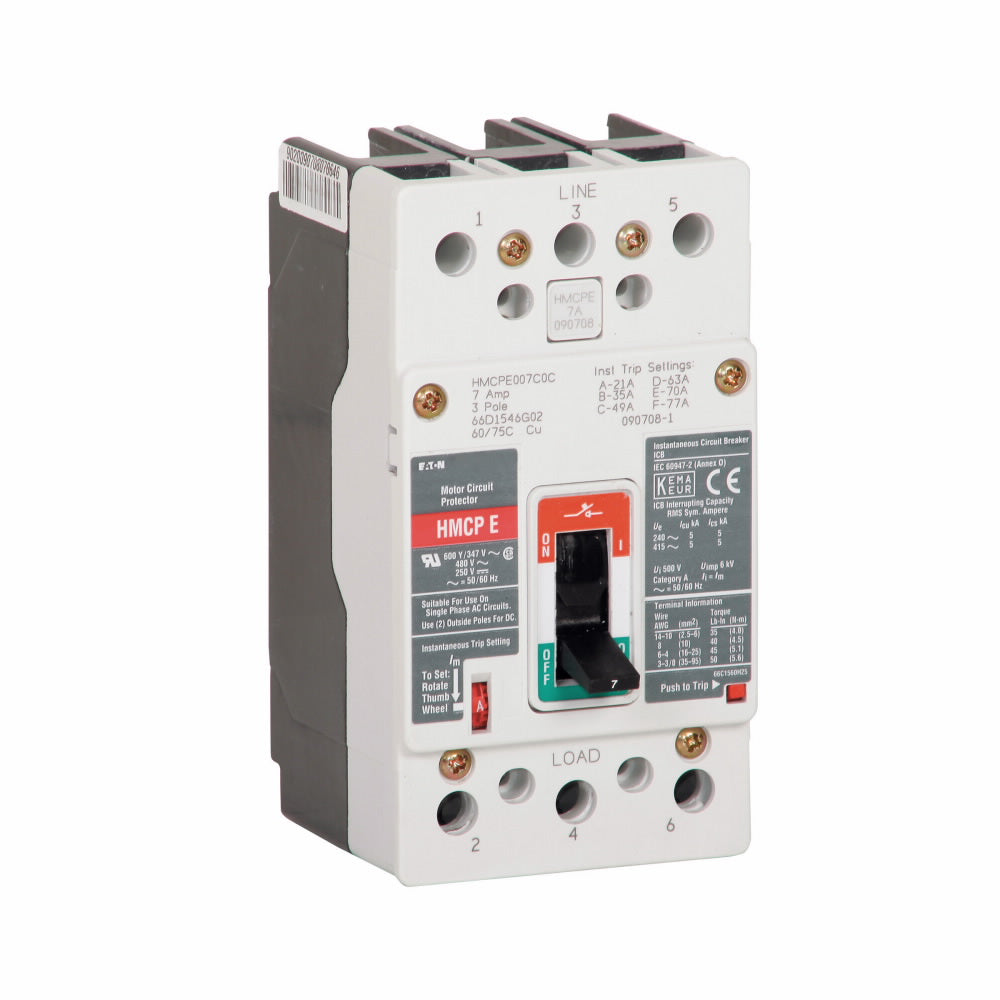 Cutler Hammer, Series G, type HMCPE, EG Frame, 3P, 3PH, 7A, 480V, 600Y/347Vac, 40 degree C, feed-thru, complete with non-interchangeable trip with I - Instantaneous protection only, non-aluminum line & load side lug terminals, MCP, motor circuit protector, magnetic range 21-77A, motor FLA 1.5-6.1A, magnetic only, molded case circuit breakers.