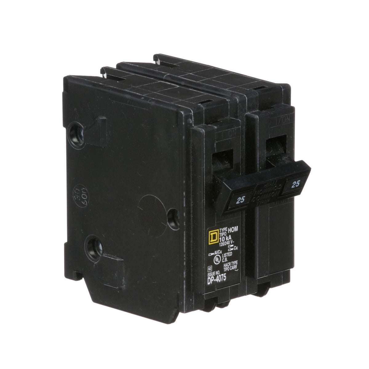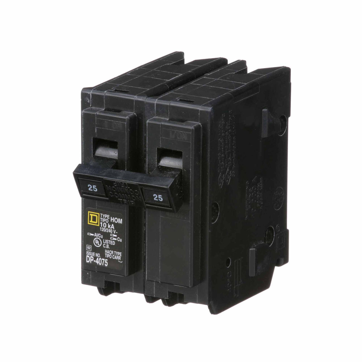 Homeline miniature circuit breakers are engineered and designed for fast installation and superior circuit protection. Homeline circuit breakers are designed to plug into Homeline load centers to provide circuit protection. This circuit breaker provides standard circuit protection and is HACR rated. This 2 pole circuit breaker with plug in mounting is rated 25A at 120/240 VAC. HOM breakers provide 10 kA breaking capacity. The electrical connection is a clamp terminal that will accept 2 wires. The clamp terminal will accept a wire range of 14 AWG to 8 AWG copper or aluminum wire. This circuit breaker has a height of 3.13 inches, a width of 1.0 inch and depth of 2.98 inches. HOM Homeline miniature circuit breakers are UL Listed.