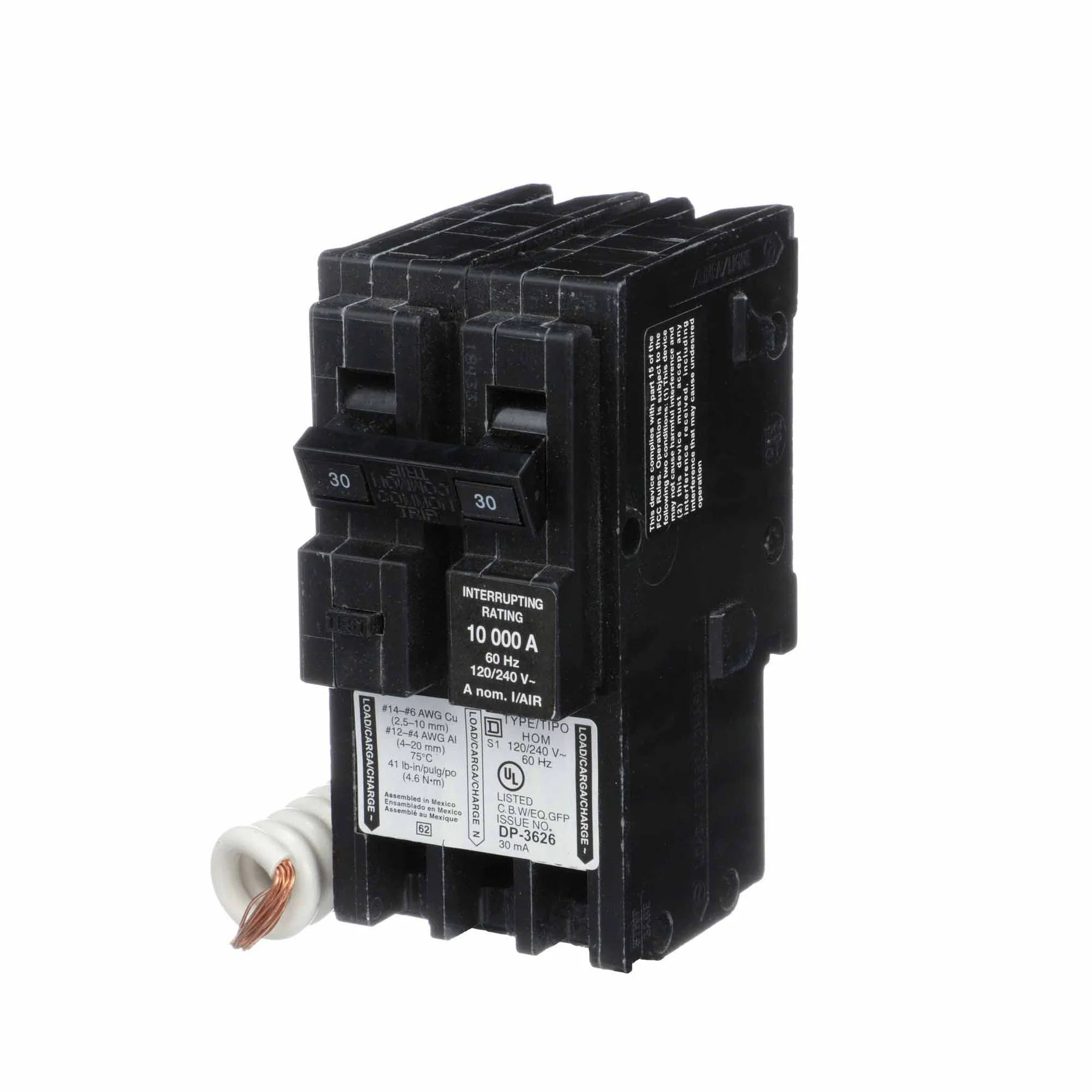 Homeline miniature circuit breakers are engineered and designed for fast installation and superior circuit protection. Homeline circuit breakers are designed to plug into Homeline load centers to provide circuit protection. This circuit breaker provides standard circuit protection and is HACR rated. This 2 pole circuit breaker with plug in mounting is rated 30A at 120/240 VAC. HOM breakers provide 10 kA breaking capacity. This Homeline circuit breaker has Class B equipment protection ground fault protection. This Homeline circuit breakers has 30mA equipment ground fault protection. The electrical connection is a clamp terminal that will accept 1 wire. The clamp terminal will accept a wire range of 14 AWG to 8 AWG copper or aluminum wire. HOM Homeline miniature circuit breakers are UL Listed.