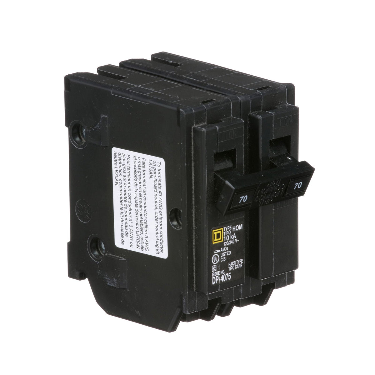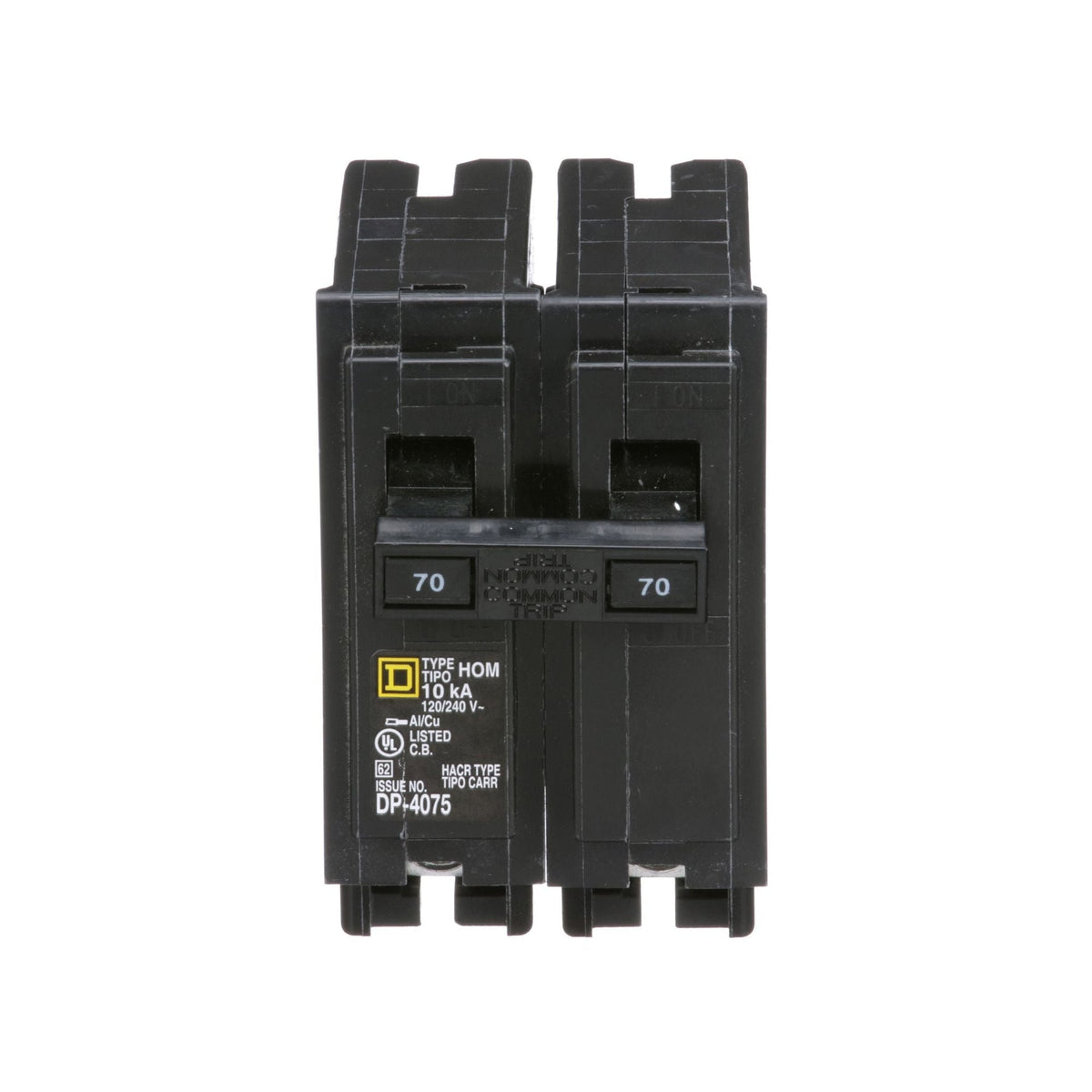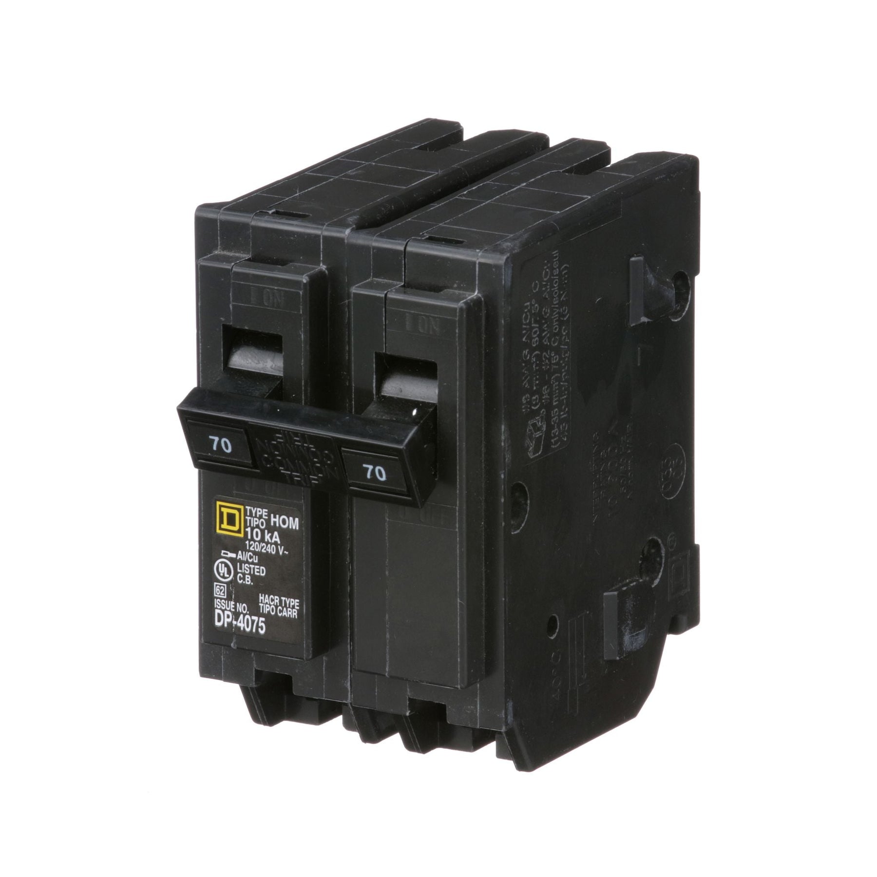 Homeline miniature circuit breakers are engineered and designed for fast installation and superior circuit protection. Homeline circuit breakers are designed to plug into Homeline load centers to provide circuit protection. This circuit breaker provides standard circuit protection and is HACR rated. This 2 pole circuit breaker with plug in mounting is rated 70A at 120/240 VAC. HOM breakers provide 10 kA breaking capacity. The electrical connection is a clamp terminal that will accept 1 wires. The box lugs will accept a wire range of 8 AWG to 2 AWG copper or aluminum wire. This circuit breaker has a height of 3.13 inches, a width of 2.0 inch and depth of 2.98 inches. HOM Homeline miniature circuit breakers are UL Listed.