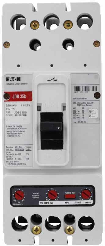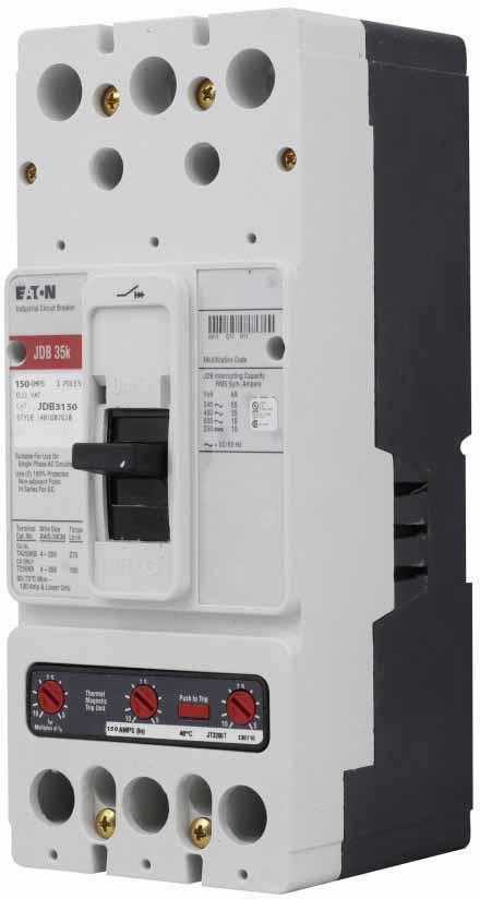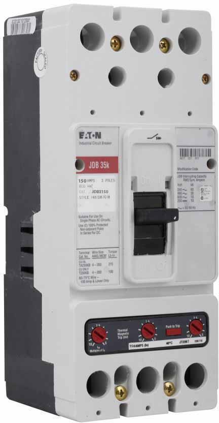 Eaton Series C complete molded case circuit breaker, J-frame, JDB, Fixed thermal, fixed magnetic trip, Three-pole, 150A, 600 Vac, 250 Vdc, 65kA@240 Vac, 35kA@480 Vac, Aluminum, Line and load, 50/60 Hz.