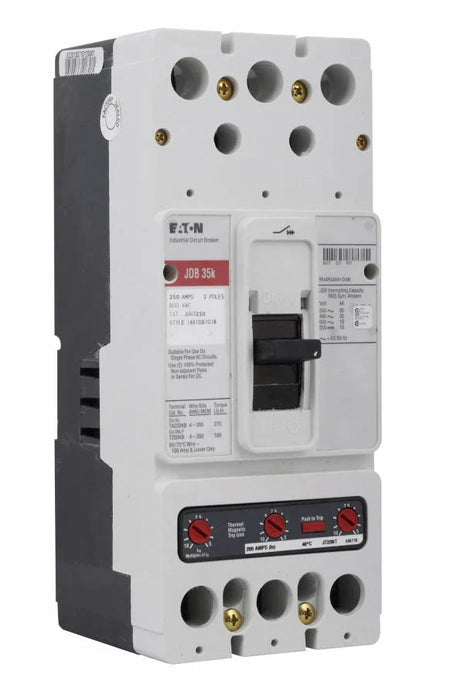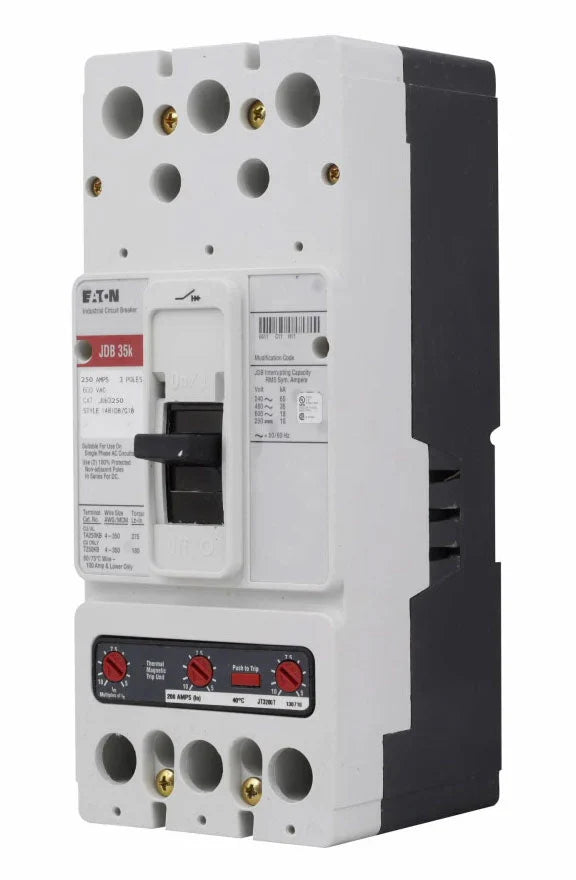 Eaton Cutler Hammer, Series C, type JDB, 3P, 3PH, 250A, 600V, 35kA@480V, standard interrupting capacity, 40 degree C, feed-thru, suitable for reverse fed applications, complete with non-interchangeable, LI - Long-Time and Instantaneous trip functions and line & load side lug terminals, thermal magnetic molded case circuit breakers