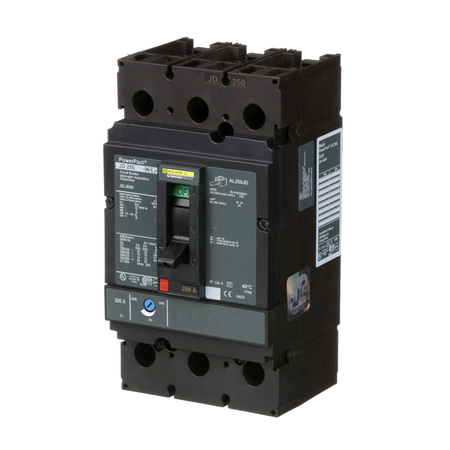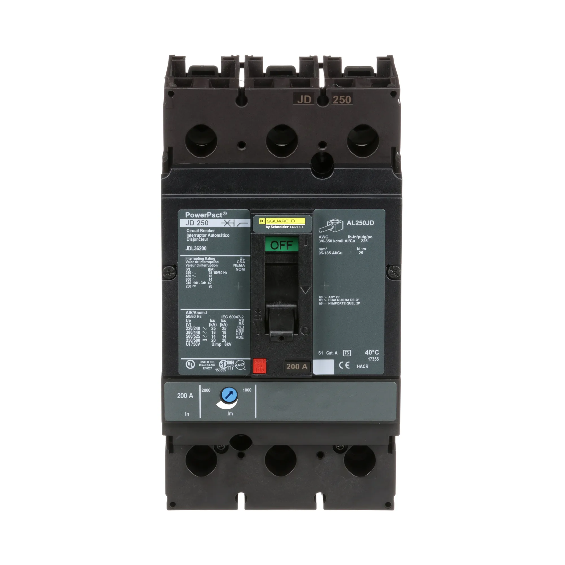 Schneider Electric / Square D, Powerpact, type JDL, 3P, 3PH, 200A, 600V, 18kA@480V, standard interrupting capacity, feed-thru, UL listed, suitable for reverse fed applications, complete with non-interchangeable trip, LI - Long-Time and Instantaneous trip functions and line & load side lug terminals, thermal magnetic, molded case circuit breakers.