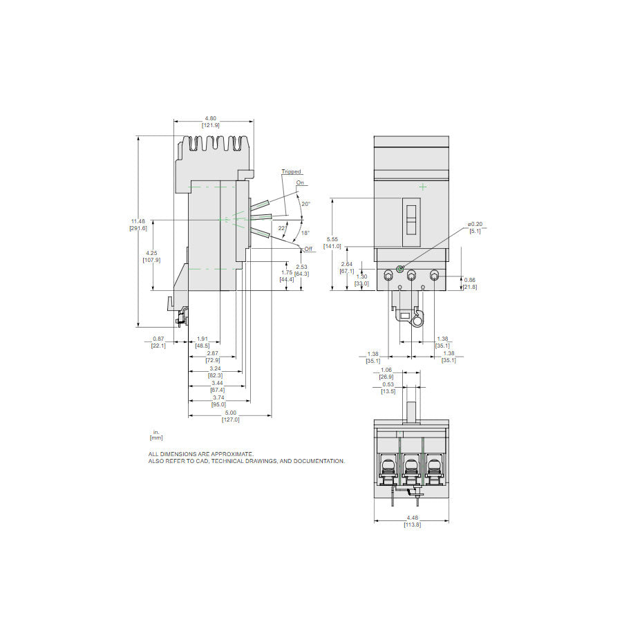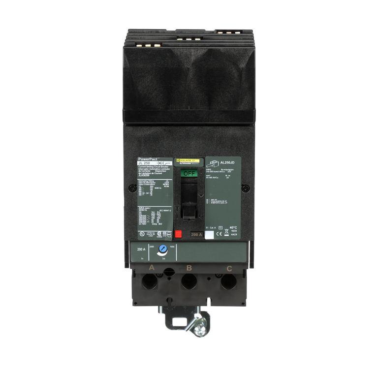 Square D, Powerpact, type JLA, 3P, ABC phase connection, 3PH, 225A, 600V, 100kA@480V, UL listed, current limiting, i-line style plug-in, suitable for reverse fed applications, complete with non-interchangeable trip, LI - Long-Time and Instantaneous trip functions, thermal magnetic, molded case circuit breakers.