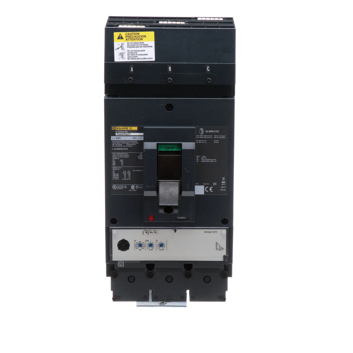 Schneider Electric / Square D, Powerpact, type LJA, 3P, 3PH, 600A, 600V, 65kA@480V, UL listed, standard interrupting capacity, i-line style plug-in, can used for 2P applications, complete with non-interchangeable micrologic standard 3.3 trip, LSI - Long-Time, Short-Time and Instantaneous trip functions, solid state electronic, molded case circuit breakers.