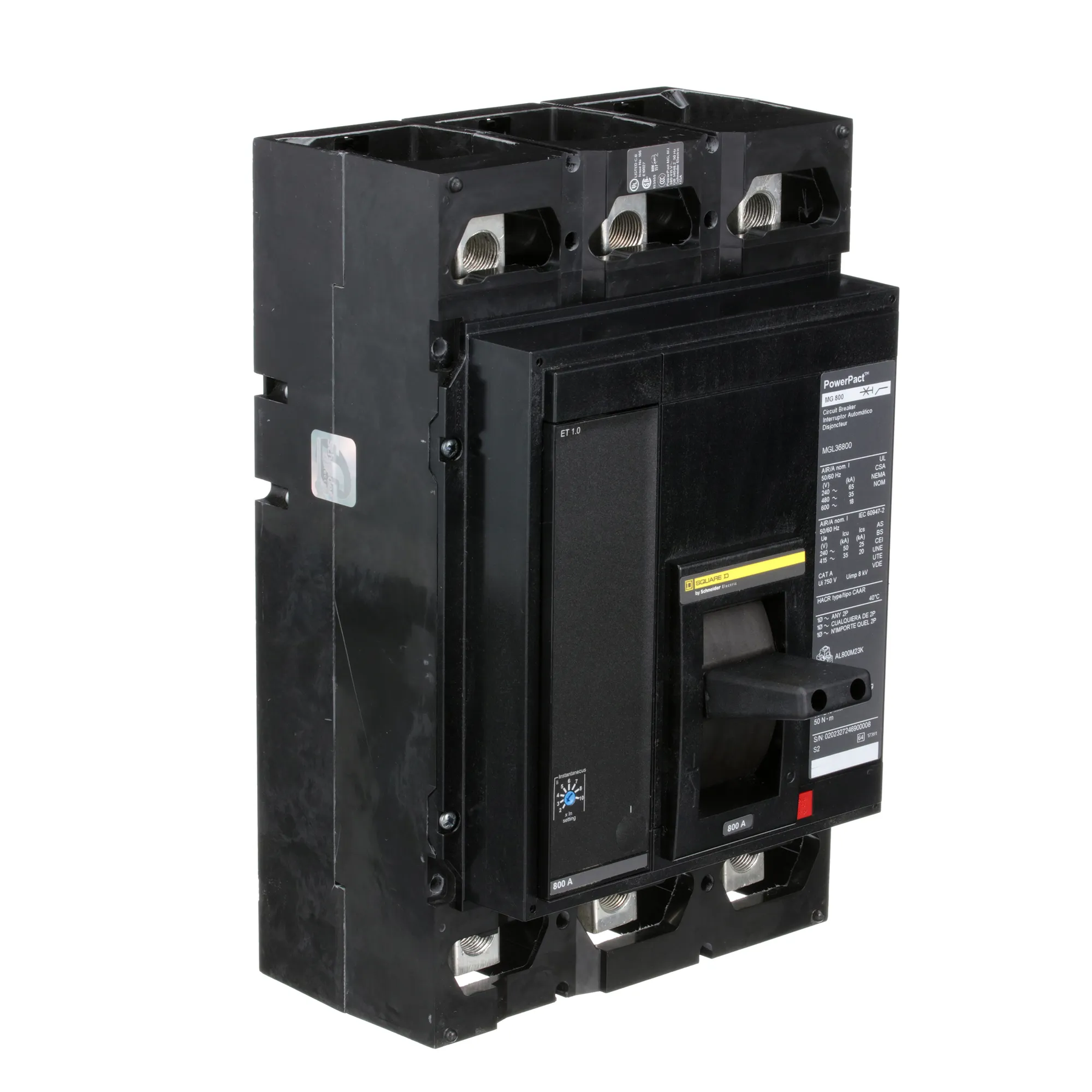 Schneider Electric / Square D, Powerpact, type MGL, 3P, 3PH, 800A, 600V, 35kA@480V, UL listed, high interrupting capacity, feed-thru, complete with basic non-interchangeable 1.0 trip, LI - Long-Time and Instantaneous trip functions and line & load side lug terminals, solid state electronic, molded case circuit breakers.