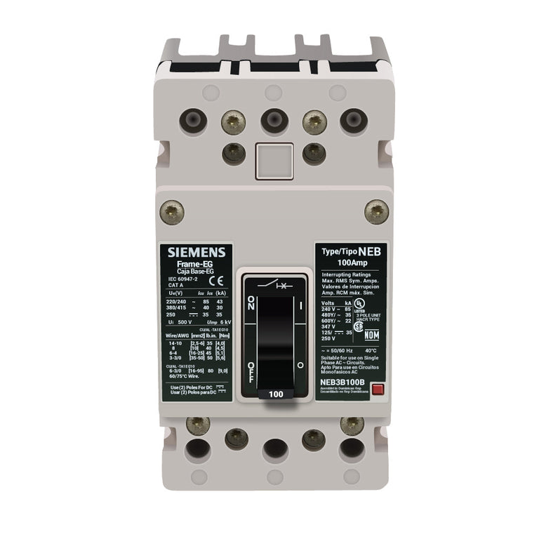 Siemens NEB Series, type NEB, 3P, 3PH, 100A, 600V, 35kA@480V, standard interrupting, 40 degree C, bolt-on, complete with load side lug terminals, thermal magnetic molded case circuit breakers.