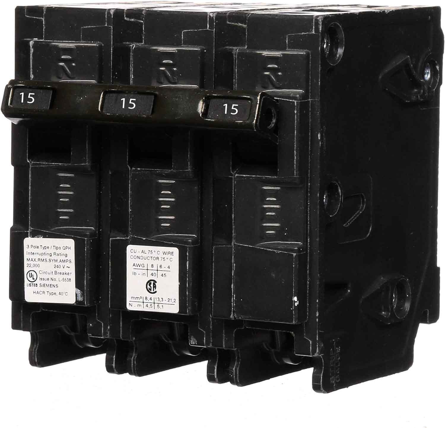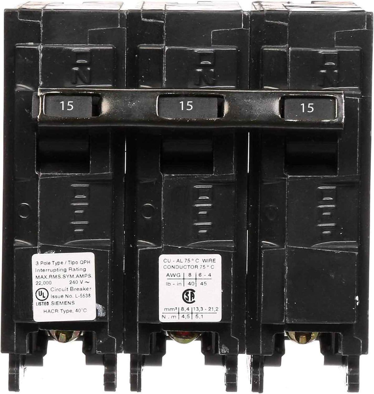 Siemens Q series three pole 15 ampere plug-in molded case circuit breaker with maximum voltage rating of 240V tripping method thermal magnetic and standard interrupting rating of 22 kiloampere at 240V complete with (LI) long-time and instantaneous trip functions and line & load side lug terminals.