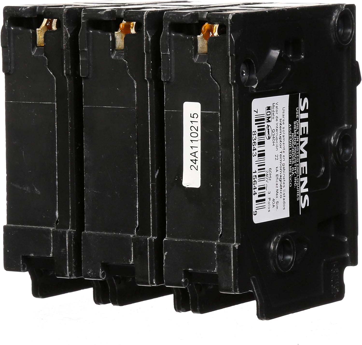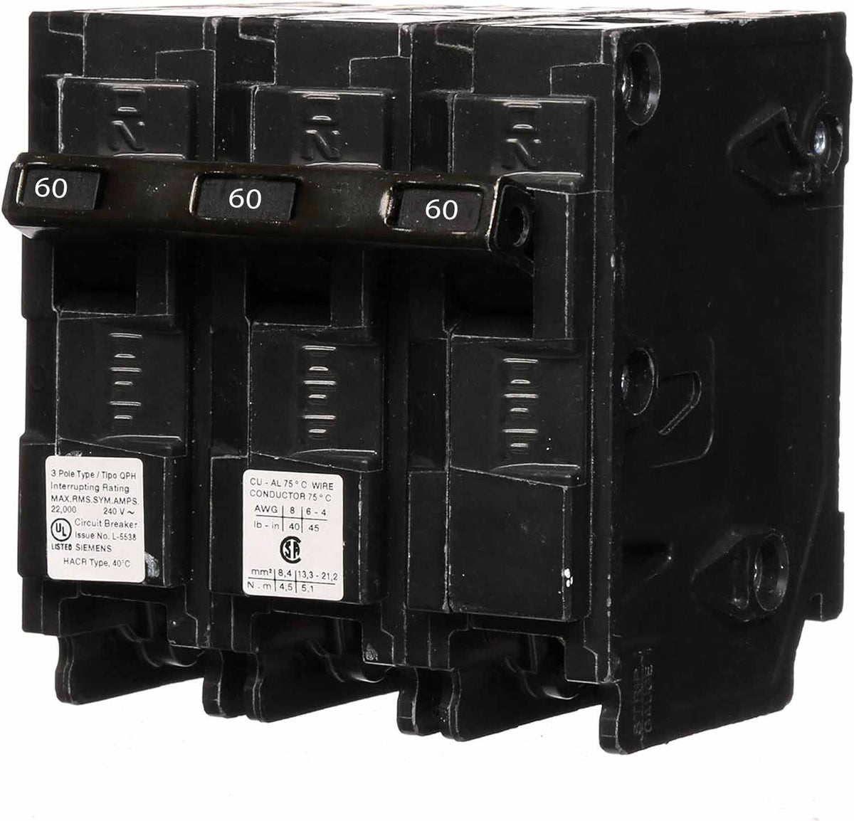 Siemens Q series three pole 60 ampere plug-in molded case circuit breaker with maximum voltage rating of 240V tripping method thermal magnetic and standard interrupting rating of 22 kiloampere at 240V complete with (LI) long-time and instantaneous trip functions and line & load side lug terminals.
