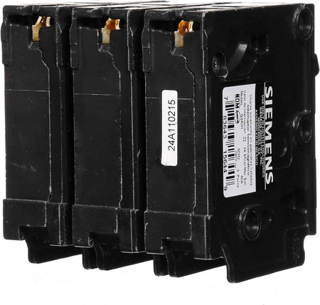 Siemens Q series three pole 80 ampere plug-on molded case circuit breaker with maximum voltage rating of 240V tripping method thermal magnetic and standard interrupting rating of 22 kiloampere at 240V complete with (LI) long-time and instantaneous trip functions and line & load side lug terminals.