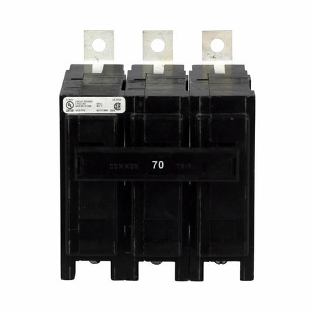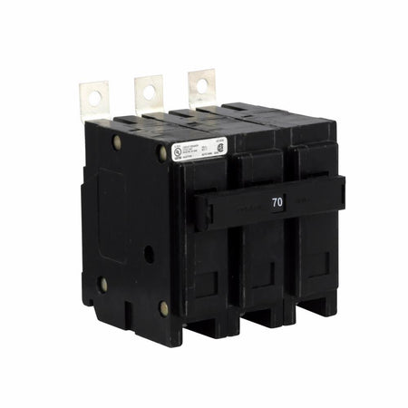 This product is a cutler-hammer circuit breaker 3-pole type qbhw termal-magnetic miniature circuit breaker has a current rating of 70 amps at 40 deg c and voltage rating of 240 vac it has bolt-on type connection.