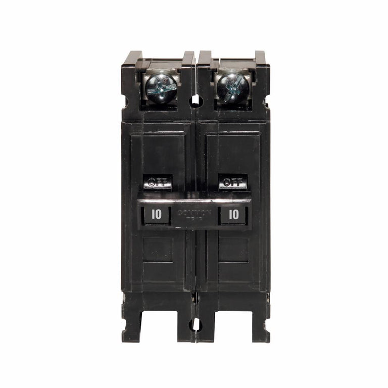 Cutler Hammer, Quicklag, type QC, 2P, 1PH, 10A, 120/240V, 10kA@240V, standard interrupting capacity, 40°C, Feed-Thru, LI - Long-Time and Instantaneous trip functions and line & load side lug terminals, Thermal Magnetic, molded case circuit breakers.