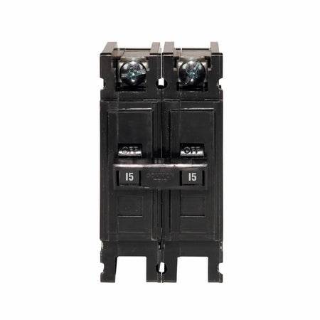 Cutler Hammer quicklag QC series double pole single phase 15 ampere feed-thru molded case circuit breaker with maximum voltage rating of 240V tripping method thermal magentic (LI) Long-Time and Instantaneous trip functions and line & load side lug terminals.