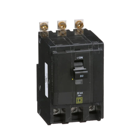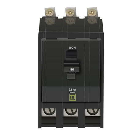 Square D QOB series three pole 80 ampere bolt-on molded case miniature circuit breaker with maximum voltage rating of 240V tripping method thermal magnetic and standard interrupting rating of 22 kiloampere at 240V functions long-time and instantaneous suitable for QOB series load centers.