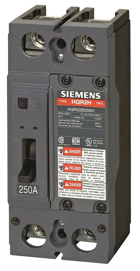 The Siemens QR22B250 is a Molded Case Circuit Breaker. This type QR2 circuit breaker is a member of The QR Series family. The QR22B250 is a 2 pole, 240 Volt, 250 amp rated circuit breaker, with an AIC rating of 10kA@240V. The QR22B250 is manufactured by Siemens. The QR22B250 uses a Bolt-On connection. Includes Thermal Magnetic protection. Every part My Circuit Breakers sells is also backed by our industry-leading gold standard 2-year warranty.