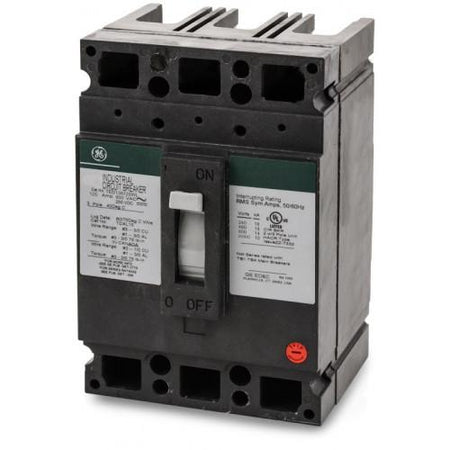 General Electric, E150 Line, type TED, 3P, 3PH, 125A, 600V, 18kA@480V, complete with line & load side lug terminals, standard interrupting capacity, 40 degree C, feed-thru, thermal magnetic, molded case circuit breakers.