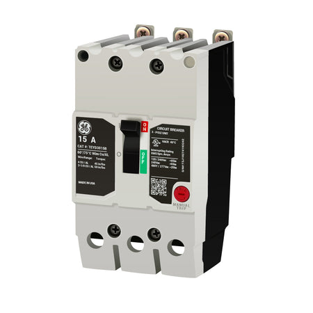 General Electric, TEYD Series, type TEYD, 3P, 3PH, 15A, 480/277V, 25kA@480V, standard interrupting capacity, 40 degree C, bolt-on, non-interchangeable trip, LI - Long-Time and Instantaneous trip functions, load side lug terminals, thermal magnetic.