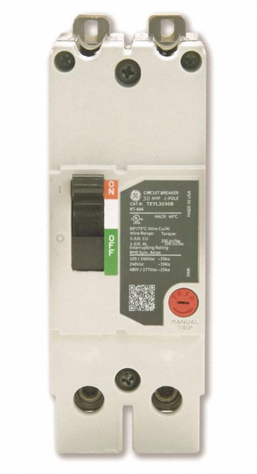 General Electric, TEYL Series, type TEYL, 2P, 1PH, 30A, 480/277V, 65kA@480V, very high interrupting capacity, 40°C, bolt-on, non-interchangeable trip, LI - Long-Time and Instantaneous trip functions, load side lug terminals, thermal magnetic.