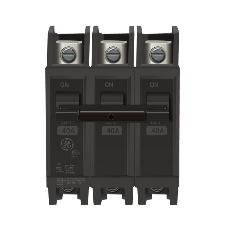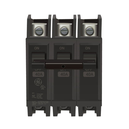 General Electric, type THQC, 3P, 3PH, 40A, 240V, 10kA@240V, UL listed, feed-thru, complete with LI - Long-Time and Instantaneous trip functions and line & load side lug terminal, thermal magnetic molded case circuit breakers