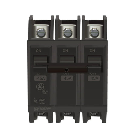 General Electric, type THQC, 3P, 3PH, 45A, 240V, 10kA@240V, UL listed, feed-thru, complete with LI - Long-Time and Instantaneous trip functions and line & load side lug terminal, thermal magnetic molded case circuit breakers