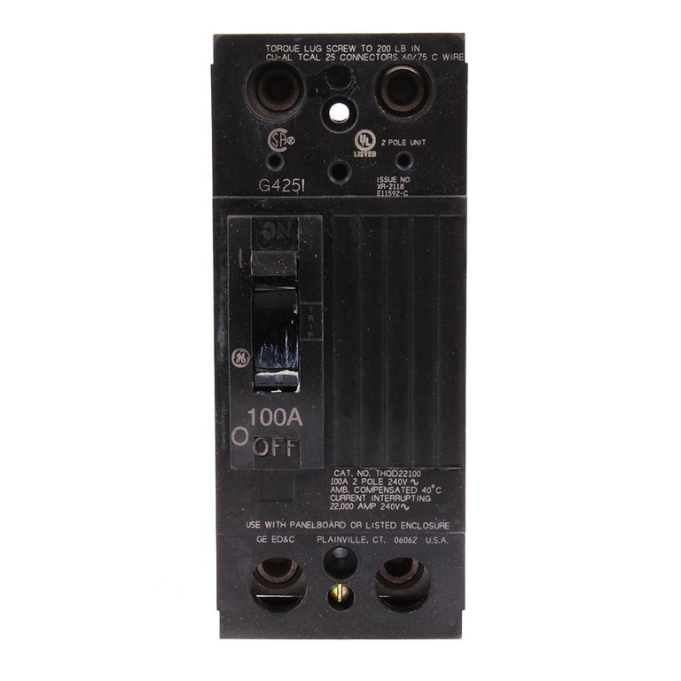 General Electric Q-Line, Type THQD, 2P, 1PH, 100A, 240V, 22kA@240V, complete with non-interchangeable trip unit and line & load side lug terminals, high interrupting capacity, 40 degree C, feed-thru, thermal magnetic molded case circuit breakers.